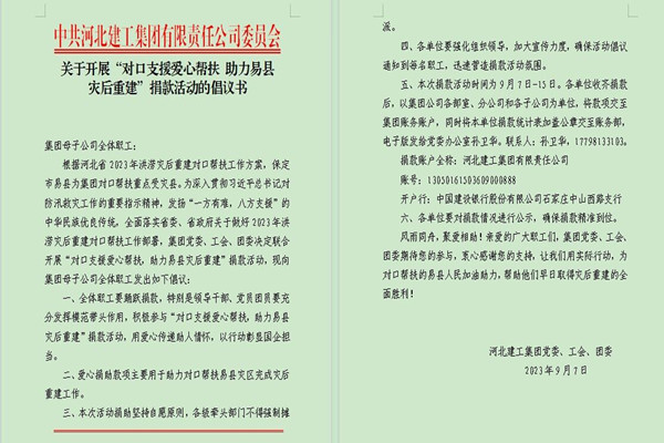 为全面落实省委、省政府关于做好2023年洪涝灾后重建对口帮扶工作部署,根据河北省2023年洪涝灾后重建对口帮扶工作方案,集团党委、工会、团委近日联合开展“对口支援爱心帮扶,助力易县灾后重建”捐款活动,帮助集团对口帮扶的易县灾区渡过难关,重建家园。