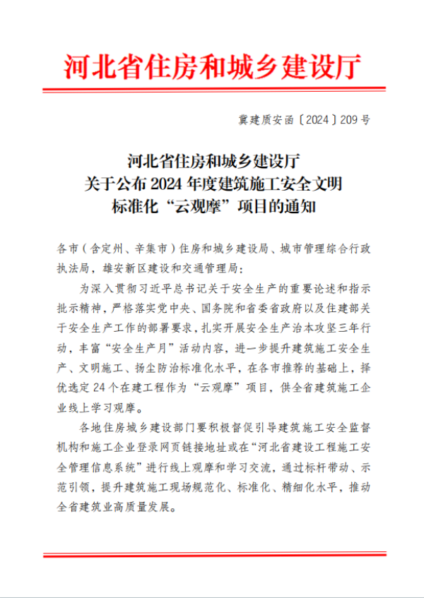 河北省“云观摩”工地是为全面推动河北建筑施工安全生产、文明施工、扬尘污染防治管理水平提升,充分发挥先进企业、重点项目在安全生产标准化、文明施工、信息化管理和施工扬尘管控等方面的示范引领作用,是河北省建筑施工安全文明标准化最高荣誉!