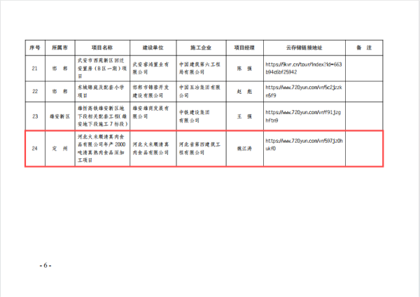 6月18日,河北省住建厅公布2024年度河北省安全文明标准化“云观摩”工地名单。集团公司施工的太行软件产业园一期、宁晋县产教融合示范基地项目、界家屯片区棚户区改造项目,河北二建施工的宁晋县中西医结合医院病房楼建设及提升工程,河北四建施工的宁晋医养综合体工程、河北火来顺清真肉食品有限公司年产2000吨清真熟肉食品深加工工程等6项工程均名列其中,供全省建筑施工企业进行线上实景观摩和学习。