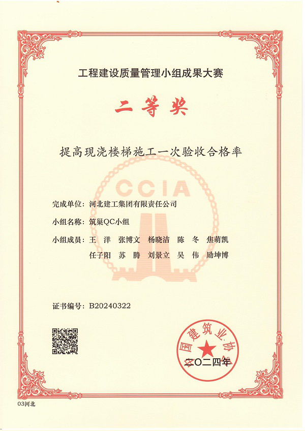 十分公司博智QC小组的成果《提高墙体粘贴矿棉板平整度一次验收合格率》、筑巢QC小组的成果《提高现浇楼梯施工一次验收合格率》、奋进QC小组的成果《提高砌筑墙体门窗洞口预留一次验收合格率》;上海分公司创业园QC小组的成果《提高ALC墙板一次安装合格率》;西北分公司鳌头一霸QC小组的成果《提高NP节能装饰一体板一次安装合格率》以及钢结构分公司网架QC小组的成果《提高螺栓球网架整体顶升安装一次验收合格率》荣获二等奖;天津分公司奋发向上QC小组的成果《提高双T板吊装一次合格率》和市政分公司启航QC小组的成果《提高铝板金属屋面次龙骨安装合格率》荣获三等奖。
