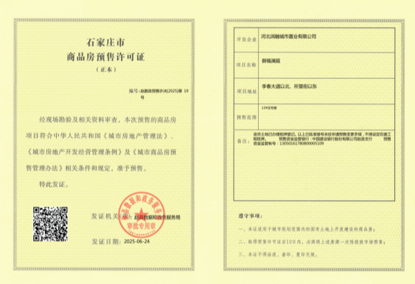 近日,房地产公司赵县祥云·御福澜庭项目传来重大喜讯:项目最后一栋楼压轴楼栋13#楼商品房预售许可证提前获批!这标志着这个备受瞩目的由15栋高品质住宅楼组成的城市标杆项目,其开发建设取得了里程碑式的进展,项目整体进入全面销售和交付准备的全新阶段。至此,祥云·御福澜庭项目全部“五证”齐全,为业主安心置业与幸福归家提前奠定了坚实的基础。